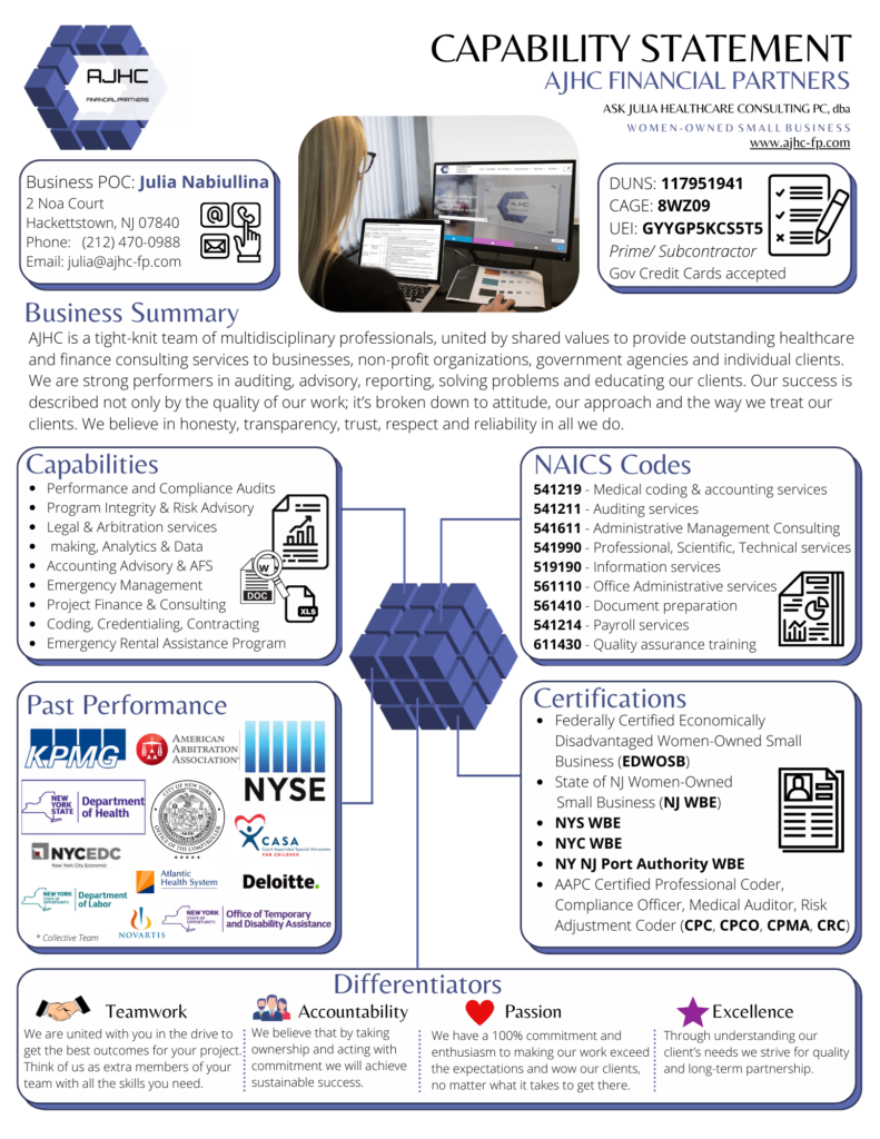 NYS certified MWBE, audit advisory, business management , manager , finance , healthcare meeting , healthcare , meeting, AJHC Careers, AJHC, AJHC Financial Partners, AJHC FP, Julia Nabiullina, FQHC, Healthcare, Healthcare Providers, RHC, Healthcare Finance, auditing, healthcare consulting, ICR, Cost report, coding, billing, AHCF, Ask Julia Healthcare, compliance, Government contracting, Healthcare Provider, data reporting, audit